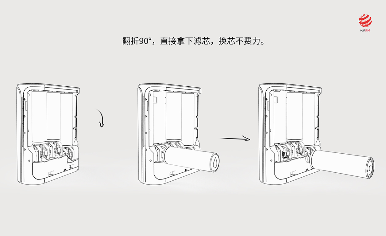 于是我們從使用方式上做了改良設計,利用杠桿的原理,設計了一個巧妙地旋轉90度的創新結構,只要旋轉90度就輕松的取出濾芯。