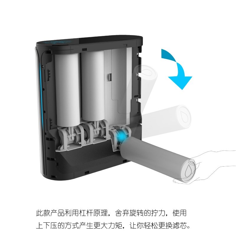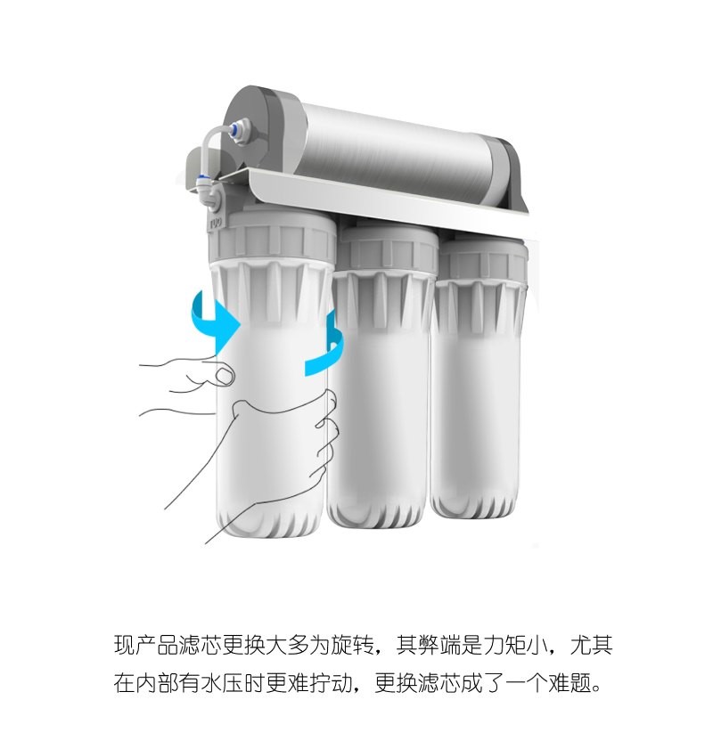 以往市面上的凈水器產品需要很費勁才能旋轉出濾芯,有的還需要用工具才能打開。